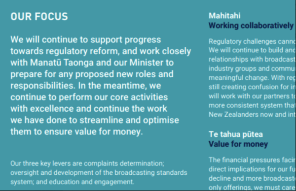2023-2027 Statement of Intent: “Less than 5% of the complaints the BSA received in the last financial year were upheld, which tells us traditional media are doing a good job of upholding community standards.” – It also means there is little point in the BSA – no business. What is the point if 95% of complaints are being successfully resolved by the broadcasters themselves? And check out the decisions for the sort of anorak, Edgelerlord, wanky, pedantic complaints that are adjudicated – a waste of time by and large. All the serious stuff is dealt with seriously: by police, or be defamation action.