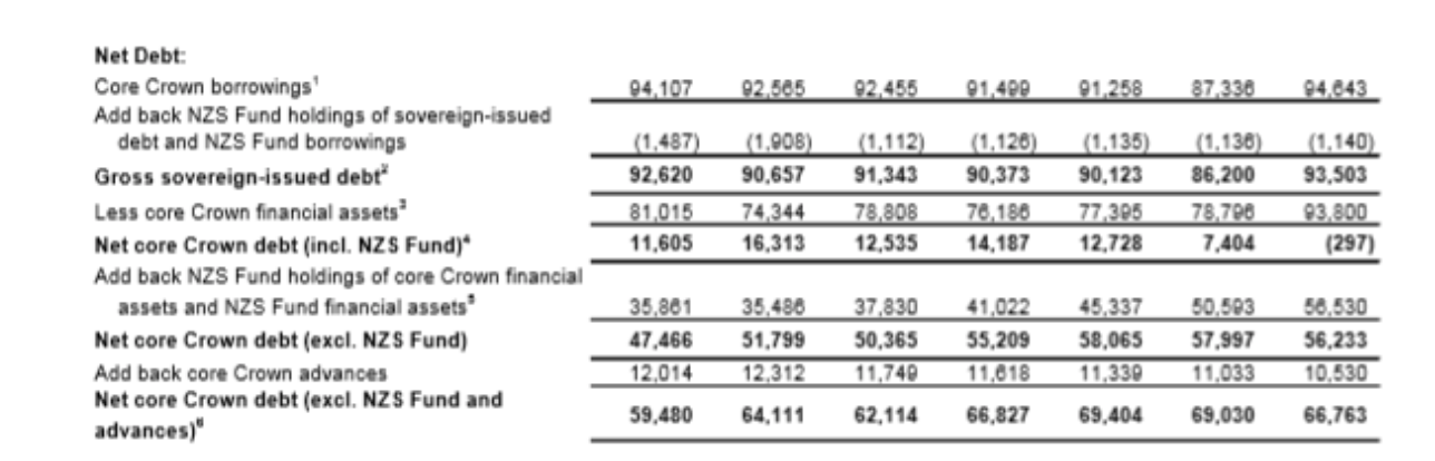 Let’s take the concept net debt as a measure of fiscal responsibility. The NZ government’s total net equity is total assets- total liabilities. Net debt is a selective subset of the balance sheet that starts with gross debt and nets off liquid financial assets such as shares and cash.