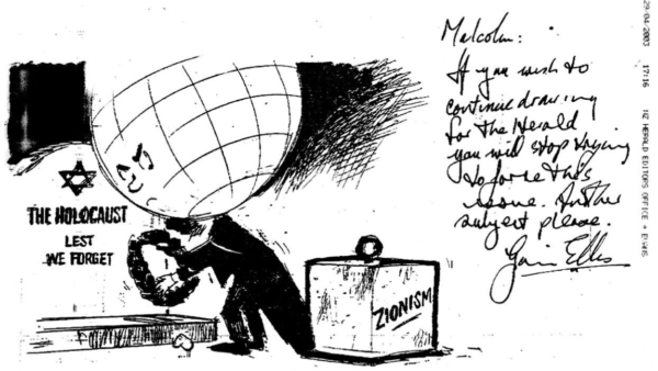 I first experienced Zionism’s influence when my cartoons caught the attention of its Auckland lobby group. It had put pressure on the Herald and so I took my cartoons to a meeting with them where their leader, lawyer Geoff Levy, assured me he was not trying to stifle criticism of Israel but rather, as just another “decent Kiwi,” was just trying to protect Jews here from anti-Semitic attack.