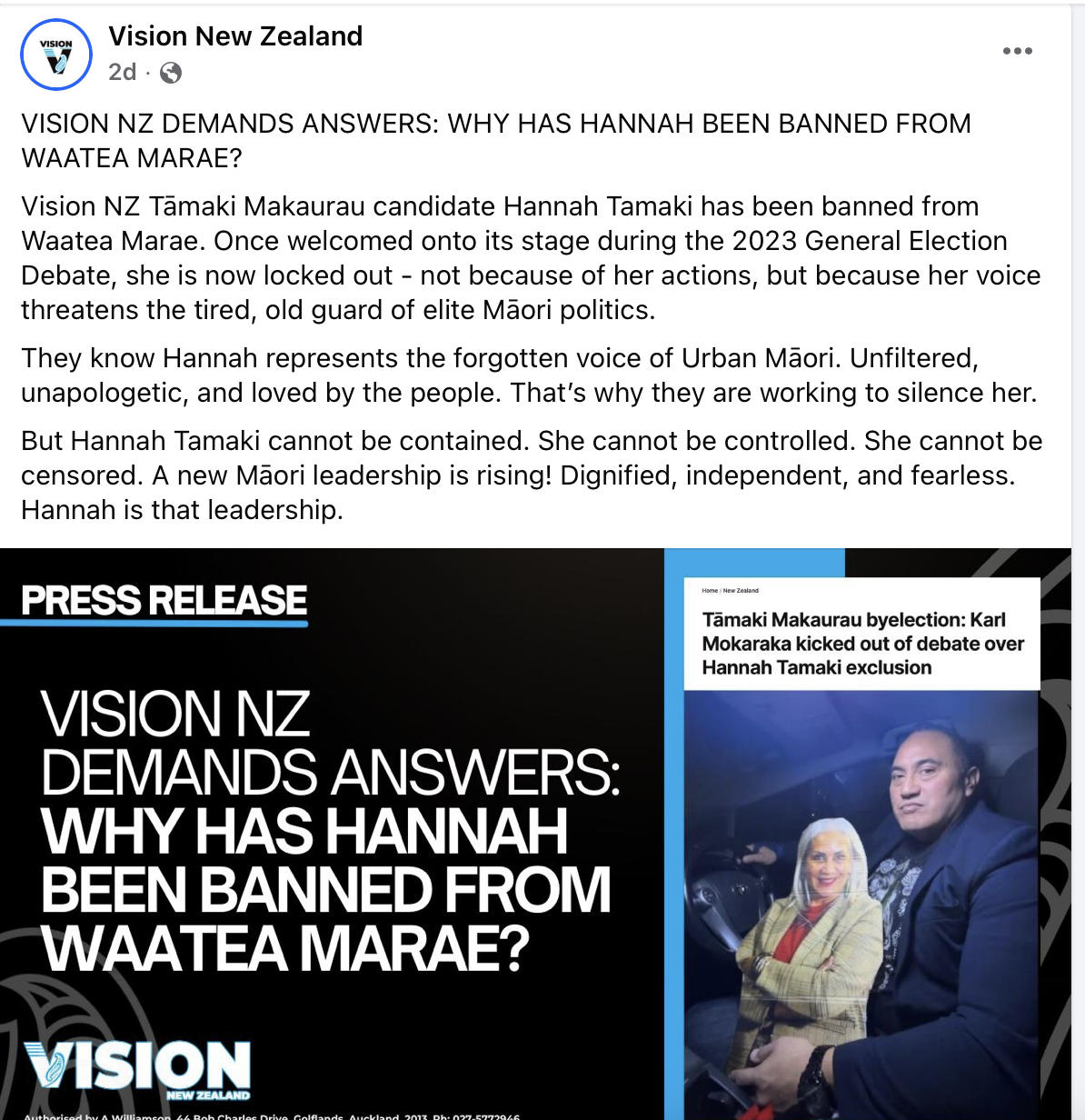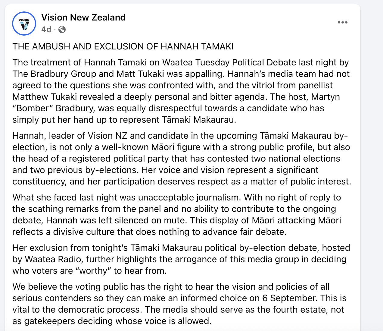 Secondly, there was no ambush, it was made very clear to Hannah and Vision NZ that I intended to ask her directly about not being invited onto the debate and what her winning would mean for Tamaki Makaurau.