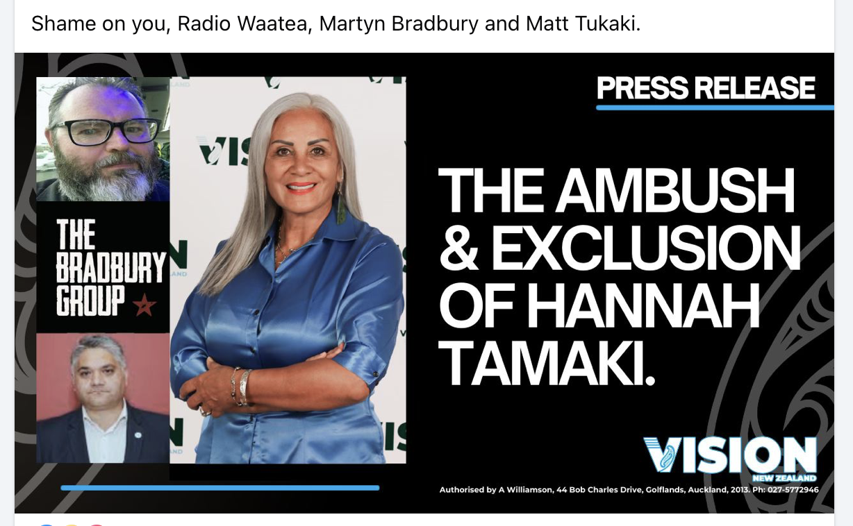 Waatea didn’t rule Hannah out from the Tamaki Makaurau by-election debate, Hannah ruled herself out by refusing to call out her husbands use of street violence!