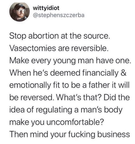 No one is safe if the State claims this power over any one of our bodies, women have every right to expect a free abortion with wrap around counselling services if required.