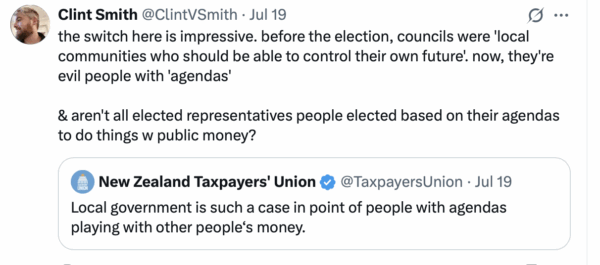 Because the Political Right are now are hilariously blaming council rates – rates they themselves have contributed the costs of by dumping 3 Waters and leaving water infrastructure costs to ratepayers alongside all the extra user pays charges central Government have forced upon everyone.