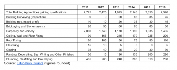 “National allowed the number of building apprentices to fall following the Canterbury earthquakes, despite the growing need for skilled builders. The number of carpenter apprentices qualifying was down 30 per cent in 2016 compared to 2011.