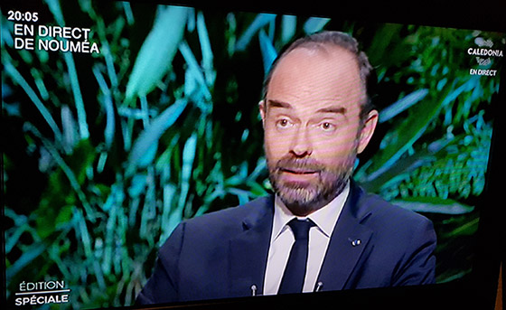 The prime minister had lunch with students at the University of New Caledonia. Following his TV address and evening “pool” interview with media, he flew back to Paris last night.