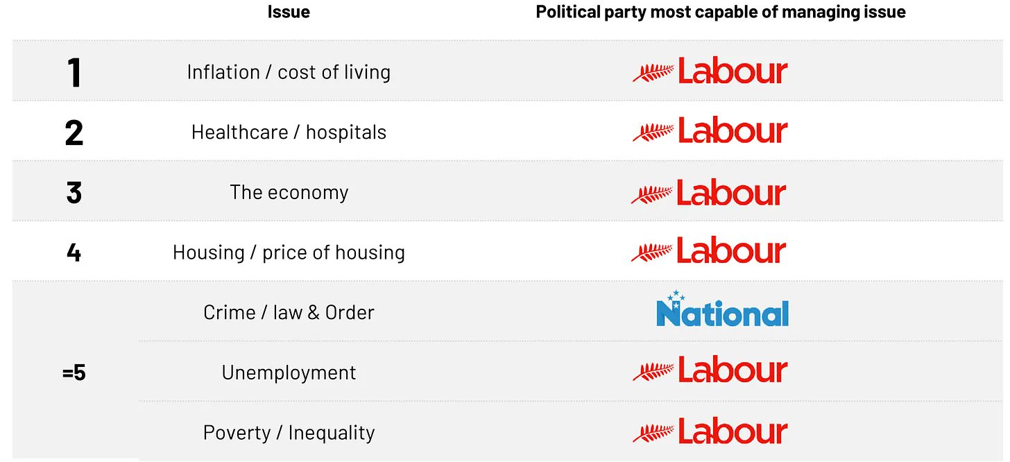 For the 20 most pressing issues for Kiwi voters, NZ First and ACT were not deemed the most capable parties to manage any of those issues. National was only deemed the most capable manager for two issues – the same result as the Green Party.