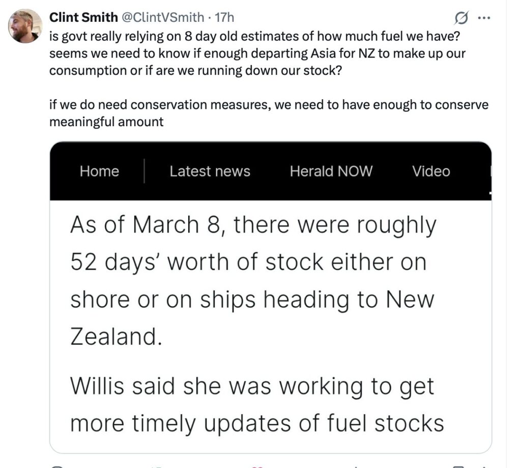 Willis acknowledges fuel rationing may be needed in worst case scenario; Last fuel ship is due in 14 days; Refined diesel costs nearing US$170/bbl, with US$200+ = NZ$4/l+