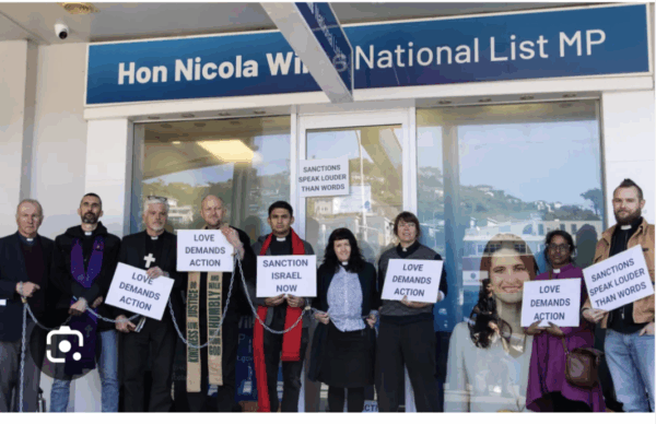 They’re members of the clergy and they’re chained to Nicola Willis’ Johnsonville office to protest the lack of sanctions on Israel. But Willis says they’re intimidating people who want to come in and see her.