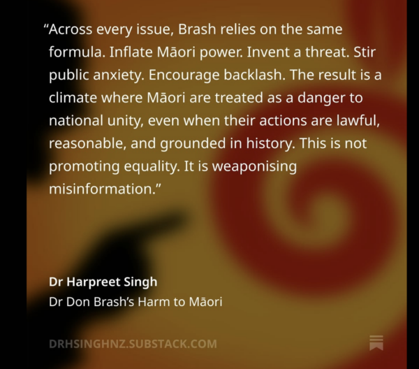 Hobson’s Pledge – what a pathetic, fatuous bunch of ‘no-hopers’ they are. Surely they could do better for NZ than continually lie, agitate and manufacture misinformation. It’s sad to see such waste of time and money when there are so many in genuine need!!!! But then they don’t care – they are “sorted” so doing good is never going to give them warm fuzzies. They thrive off hate. Even their arrogant ‘vision’ is screwball! Dr Singh – well said.
