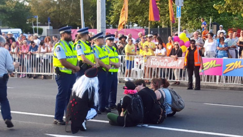 Originally a Trans Prisoner Rights activist group protesting the inane policy of putting transgendered prisoners into prisons they don’t identify with, NPIP burst out onto activists radar when they courageously challenged the corporate pink washed Pride Festival and stopped the parade to protest Corrections being allowed to march. This was followed up with pink wash graffiti attacks against the ANZ Bank who was supporting the Parade.