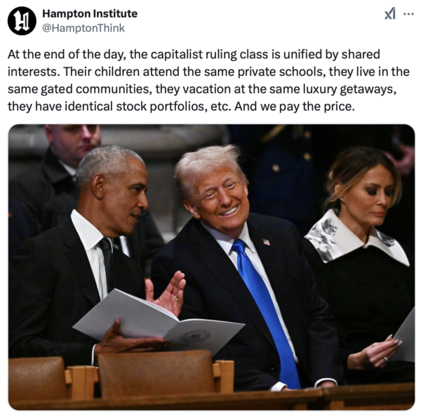 The Hampton Institute is a proletarian think tank founded in 2013, they provide Commentary, analysis, and theory on social, political, and economic issues from a working-class perspective and their recent post on Obama and Trump laughing at Jimmy Carter’s funeral highlights all that is wrong with America…