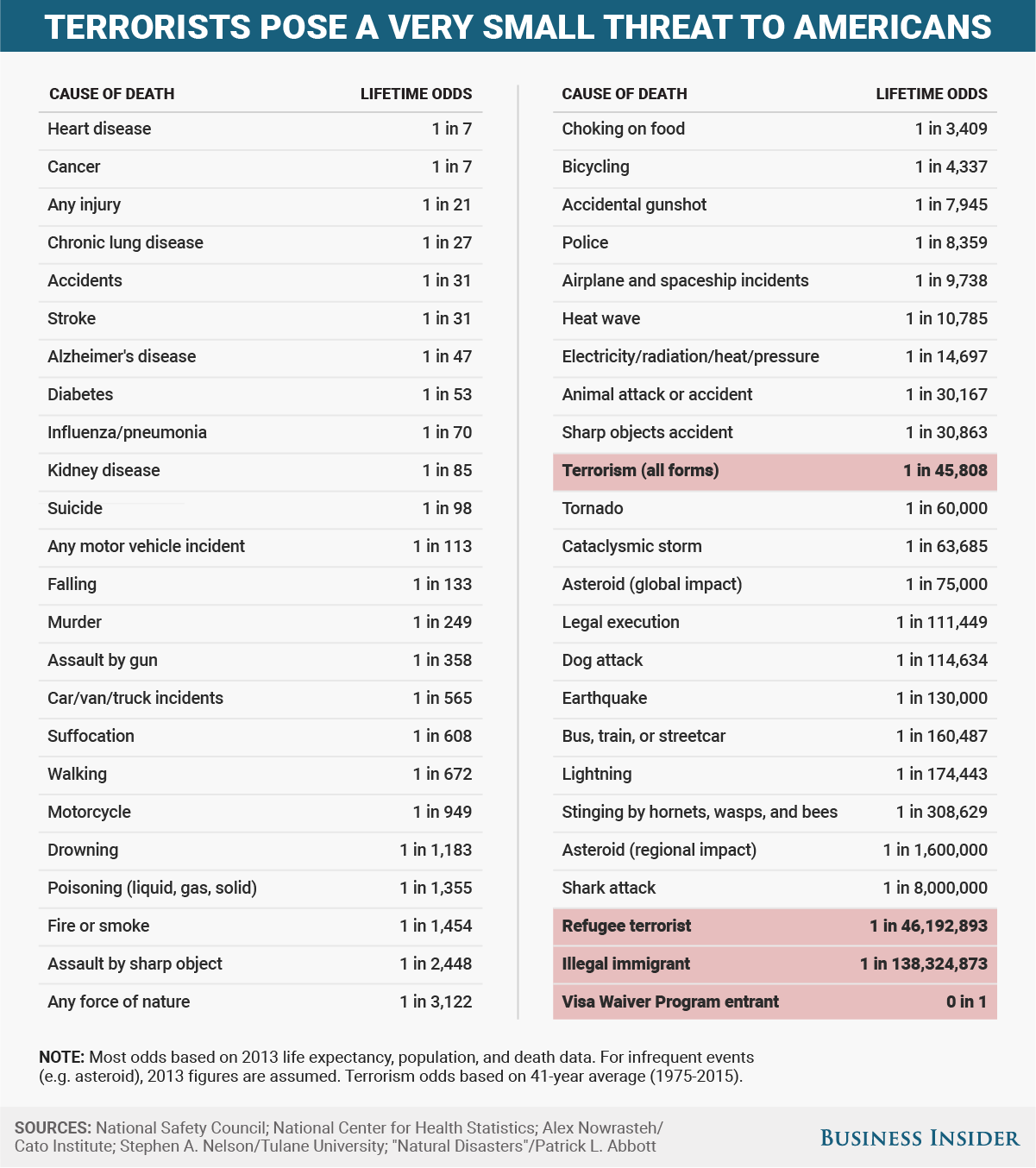 …Americans have more to fear and are far more likely to die from choking on food, bicycling, accidental gunshots, their own police force, airplane and spaceship accidents, heat waves or animal attacks than they do from bloody terrorists. For the love of God, there’s more chance an American will be killed by a fucking asteroid than a refugee or illegal immigrant.