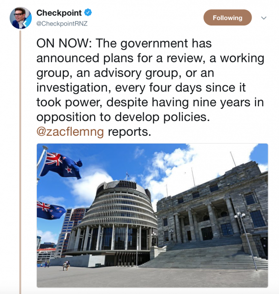 Radio NZ have done an interesting story looking at the plethora of reviews, working groups, advisory groups and investigations that the new Government have announced since coming to power…