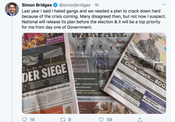 Foolish comment, wiking. No solution to gang problem that way. Thank you Martyn for a very good analysis of the situation. To my mind, policing is needed, and already being done. Simon Bridges is ridiculous, considering that the last National Govt of which he was a part underfunded all social areas including the Police, causing them to reduce number of alcohol checkpoints, making NZ the only country to have increased alcohol-related road accidents after lowering the alcohol limits. Empty words – the Nats would do a few flashy programmes, then concentrate on starving all social areas of funding so that they could balance the books and look like good managers of the economy. No chance of Soimon beating the gangs. We have to raise social conditions to the point where poor young kids can see a better way than joining a gang.