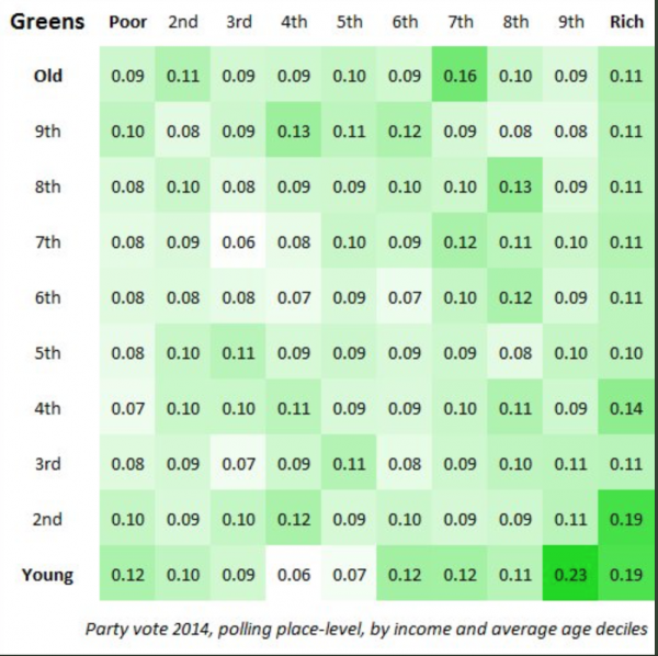 This is a heat map of voters produced by James Mulrennan that gives an idea of who the Greens need to appeal to…
