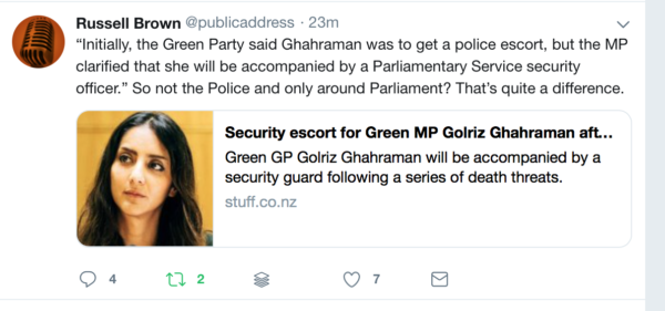 However, that said, it is only a couple of months since Green Party Co-Leader James Shaw was physically assaulted by a conspiracy theorist. Also the Greens are targeted by conspiracy theorists than any other party by a long shot. They are also bearing the brunt of Taliban 1080 opponents even though all the parties in Parliament support its use. Eugenie Sage is another Green MP who needs round the clock protection. Potentially even more than Golriz as the people targeting her have an actual history of violence including an armed hijacking of a helicopter. Sue Bradford was a Green MP and Helen Clark, while receiving death threats, had round the clock security
