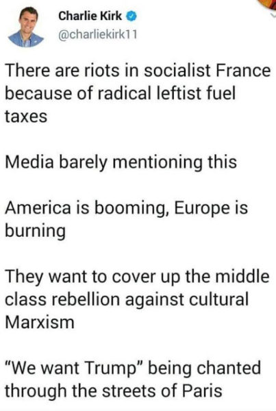 But to return to the reasoning behind this potential naescent “revolutionary moment” (yes, I’m wildly over-egging things there. How else to varnish?) – Kirk has seized, no doubt, upon the fuel-tax and upon the fact that France is relatively to the left of America on economic matters … and decided, based on these limited two data-points that this therefore means it’s a “squeezed middle” uprising against “SOCIALISM!!! ™”.