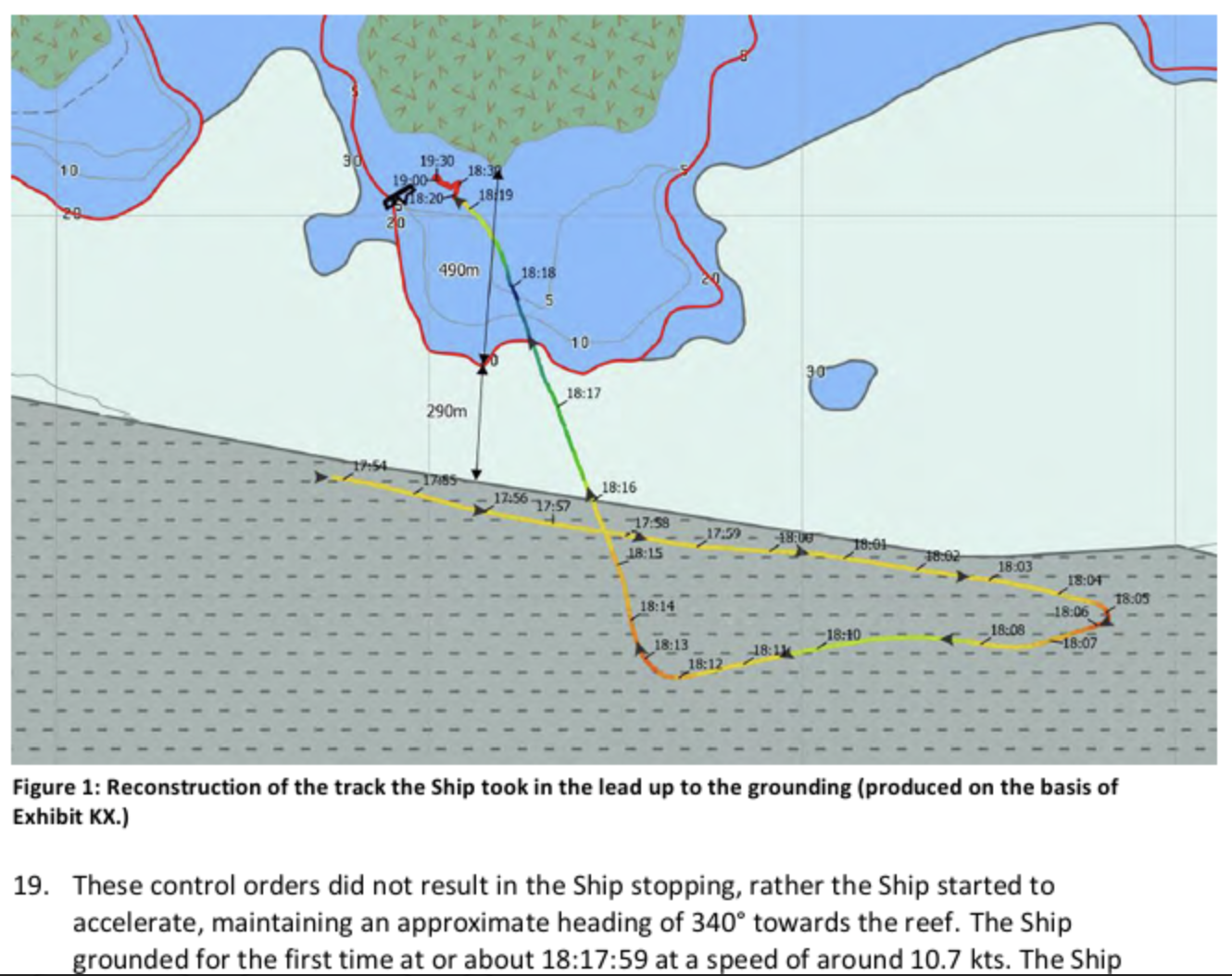 Having shat all over Witness 2 it must be said no one high up is shown to have any glory in this. I agree largely with the court’s finding that given the Commander had less than two minutes from the time she came to the bridge to the time of the grounding and given that she was entitled to rely on the information given by her officers that it is marginal to argue she should have known the autopilot was the issue. However, when I read their chronology there is some lag between officers making an order and the order actually being actioned, so we cannot assume just because the voice recording has an order that it has been carried out at all – for example the anchors took forever and it didn’t make sense having finally let the anchors out to then start bow thrusting hoping to get off the reef. Given no one could figure out what was going on the Commander should have stopped the engines – as Witness 2 had suggested at one point – but it seems they just kept powering on and on and on. The exchanges seem terse with frustration at a few points resulting in sarcastic retorts. I can’t get over seeing things like Witness 2 calling “emergency shutdown” and there being no shut down of anything at all, of anchors being readied and yet continuing power and only being dropped after they had well and truly grounded.