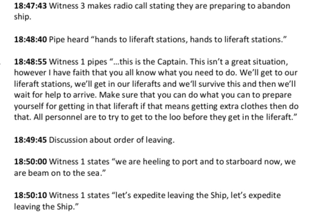18:48:55 Witness 1 pipes “…this is the Captain. This isn’t a great situation, however I have faith that you all know what you need to do. We’ll get to our liferaft stations, we’ll get in our liferafts and we‘ll survive this and then we’ll wait for help to arrive. Make sure that you can do what you can to prepare yourself for getting in that liferaft if that means getting extra clothes then do that. All personnel are to try to get to the loo before they get in the liferaft.”
