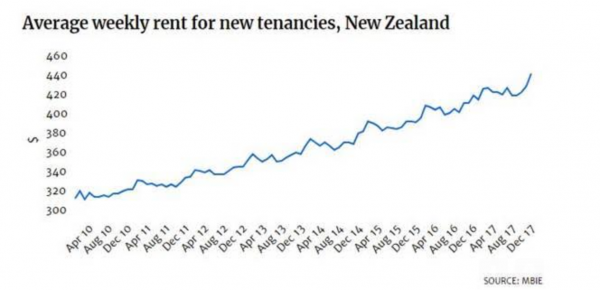The average rent for a new agreement increased by 5.4 per cent in the 12 months to December, 2017, from $426 per week to $449 – according to the Ministry for Business, Innovation and Employment.