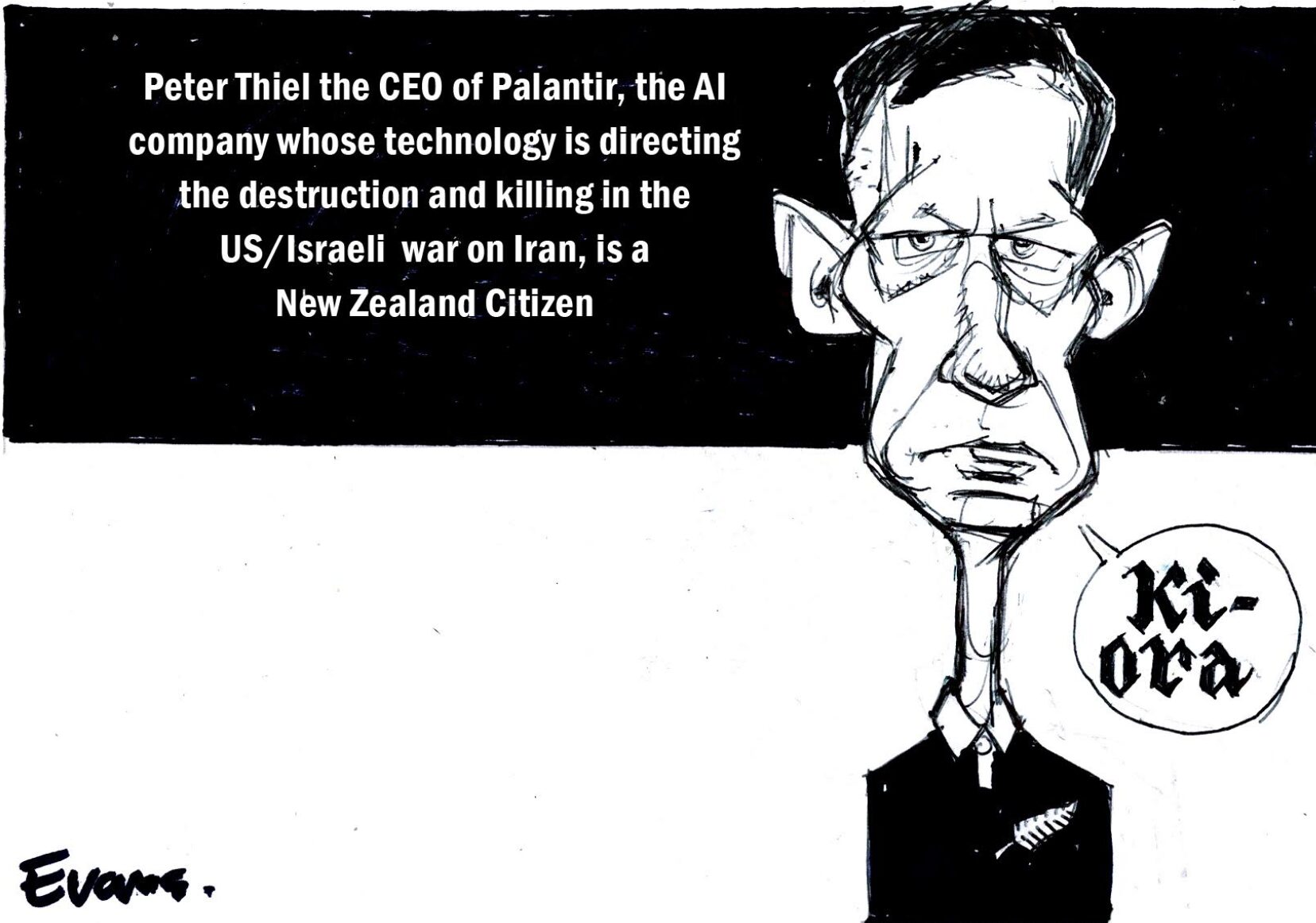 Peter Theil, CEO of Palantir, the AI company directing the killing in the US/Israel war on Iran, should be stripped of his New Zealand citizenship