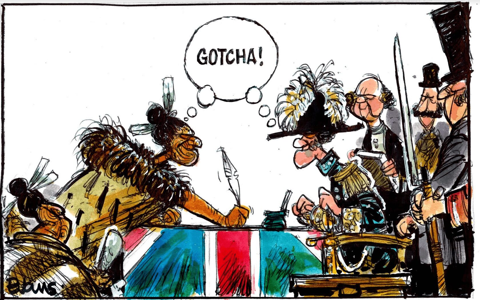 The cartoon shows the annual ceremony of presenting chins by two sides of the polity. Of course the ceremony relates to the nursery rhyme,…’Three Little Pigs”.