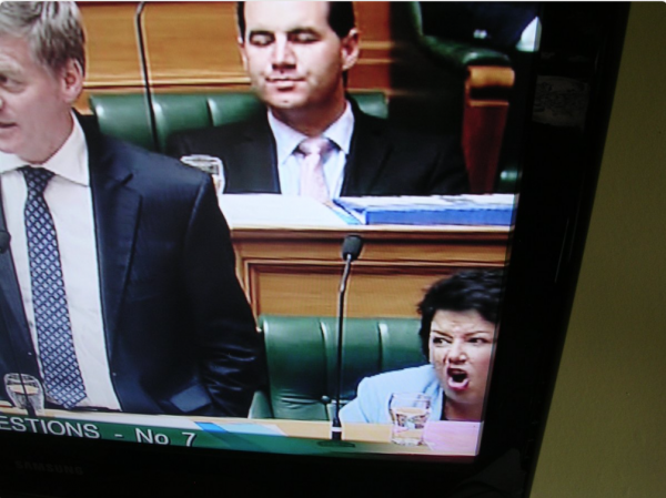 Bill “Human Soporific” English drones on in his spirit-crushing monotone, as Paula Bennett attempts to rouse a comatose Jami Lee Ross by doing her enraged howler monkey impression.