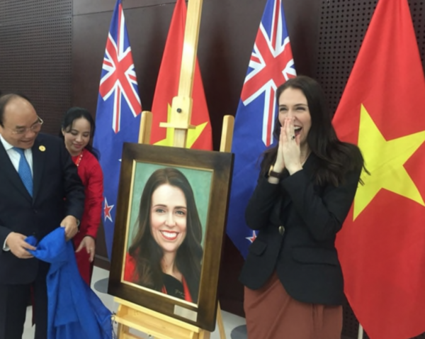 Jacinda Ardern was in Vietnam, as the Flag of Vietnam – gold star on red background – signifies.