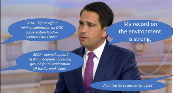 When Simon Bridges says he has a strong environmental record he means for the oil and mining companies