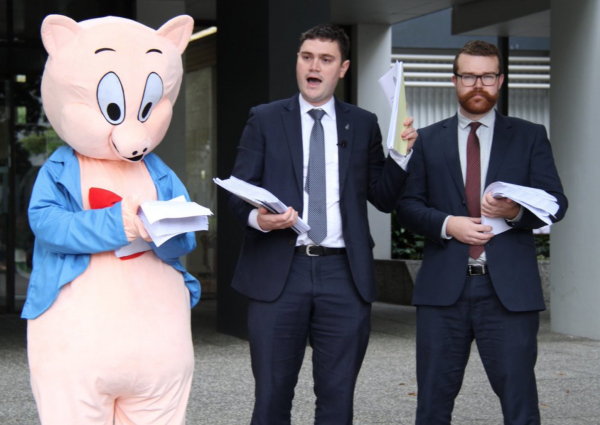 Look at the deep depression in the face of the bearded right wing clown on the right. Did he work hard in Wellington to one day stand next to a pig and a man in pig costume? Watch as his professional life flashes before his eyes as he questions every decision that has led him to this moment.