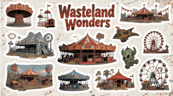 What is so appealing about a post-apocalyptic carnival is its anarchy. The rules are out the window. Safety checks? Who cares? Uniformity? It’s a place where artists can abandon clean lines and perfect color palettes and dive into the stunningly shattered. It’s about throwing all we adored as children—rides, prizes, flashing lights—into a blender with rust, tech waste, and malfunctioning AI fantasies.