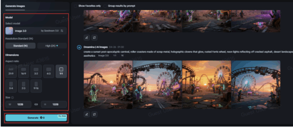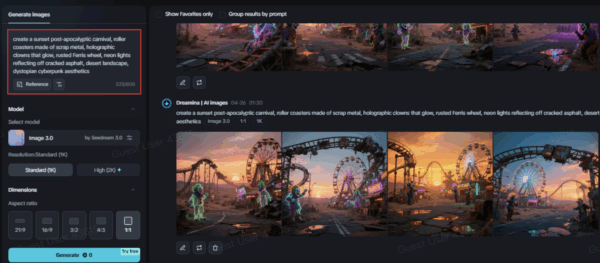For instance, attempt something similar to: “A sunset post-apocalyptic carnival, roller coasters made of scrap metal, holographic clowns that glow, rusted Ferris wheel, neon lights reflecting off cracked asphalt, desert landscape, dystopian cyberpunk aesthetics.” The prompt instructs Dreamina to merge dirty realism with fantastical sci-fi expression, resulting in a carnival that’s haunting and hypnotic.