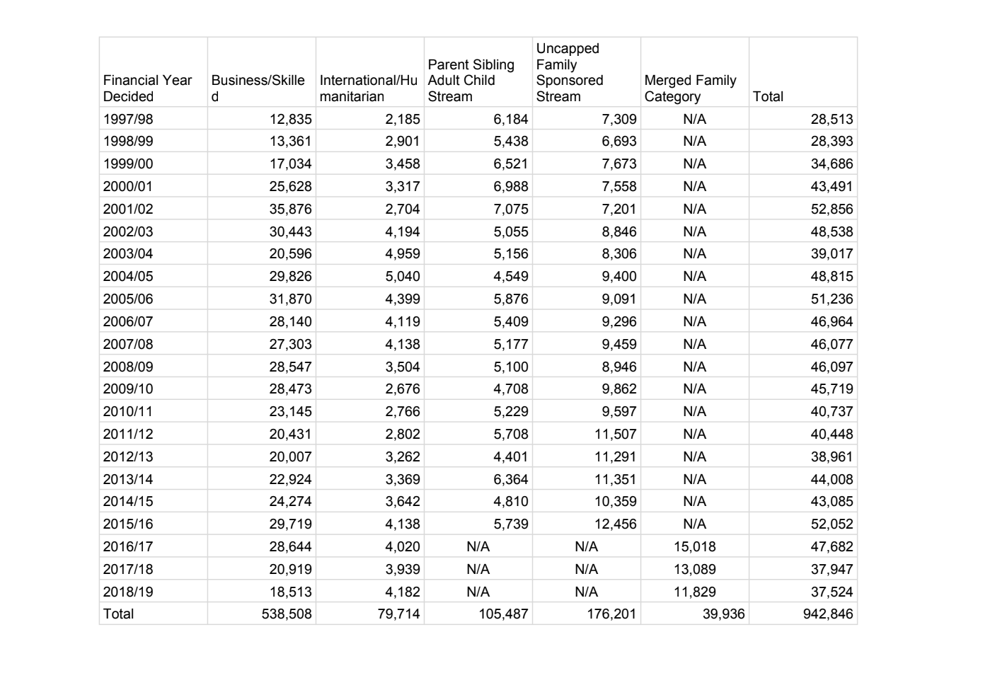 There are three broad categories of permanent migrants: Business/Skilled; International/Humanitarian; Family. For the last twenty years, NZ accepted around 25,000 in the skilled/business category, 3500 for international/Humanitarian and 15,000 for family (including about 5000 for parents).