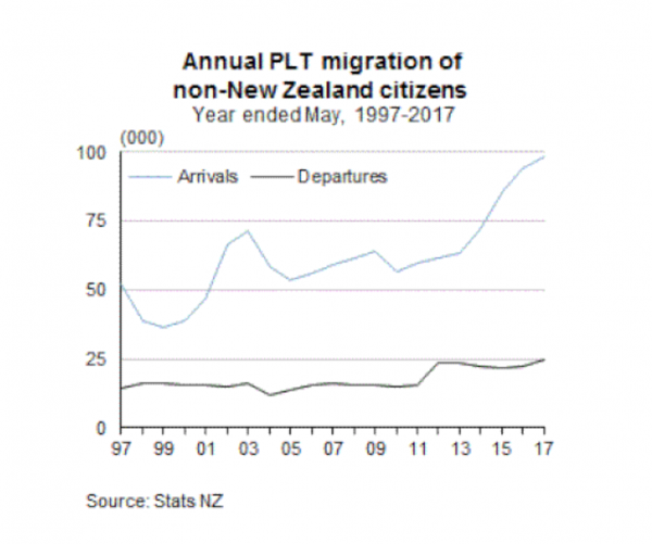 “The continued high level of net migration in the May 2017 year was driven by non-New Zealand citizens migrating to New Zealand,” population statistics senior manager Peter Dolan said. “Of the 130,400 migrant arrivals, 3 out of 4 were non-New Zealand citizens.”