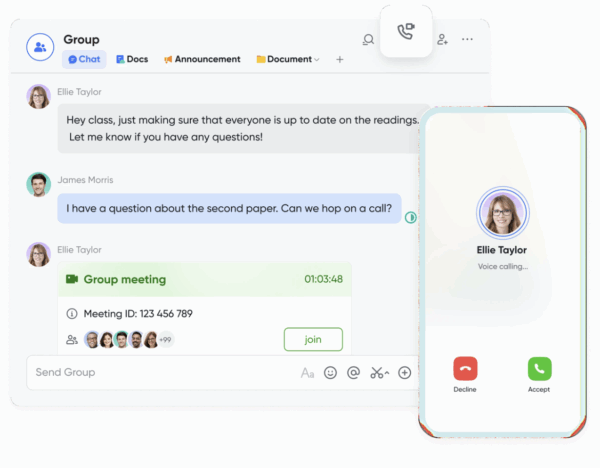 Teams may start calls immediately from Meetings, share Docs while they talk, and send out Tasks right away. If a client asks for changes, the responsibilities are written down immediately away and linked to Base so they can be tracked. Recordings and transcripts make sure that everything is written down, so nothing is overlooked.