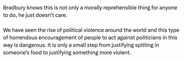 Thirdly, the blog in question had about 650 views, Winston broadcast that to his Twitter followers and it’s been viewed 30 000 times so if someone does spit in his food, he’s the one who amplified that and made it happen, which would be a glorious irony in of itself.