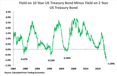 “Figure 1 shows over the long run the relation between U.S. long term, 10 year, and short term, two-year bond interest rates – that is, how much the two interest rates differ. As can be seen, almost always U.S. long term interest rates are higher than short-term ones. This is logical because the risk of lending money over a long period is greater than over a short period – so a greater reward, a higher interest rate, has to be paid to get someone to lend money for a longer period. But, as can be seen, on four occasions this normal relation has changed and short-term interest rates became higher than long term ones. On each of the three previous occasions this event, the inversion of the yield curve, was followed by very serious problems in the U.S. economy.”