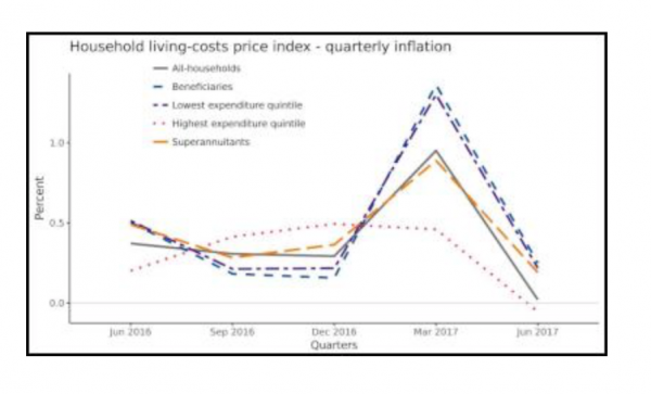 In the June 2017 quarter, higher prices for vegetables and electricity had a large effect on all groups. This was countered by lower prices for petrol.