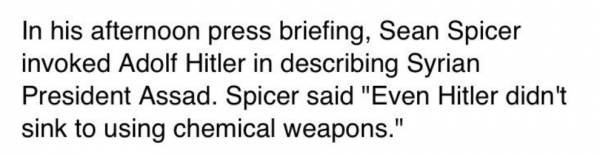 Someone should advise Spicer that if he wants to make Hitler comparisons then to remember at least Hitler did not use nuclear bombs like the US did on the people of Hiroshima and Nagasaki in 1945.