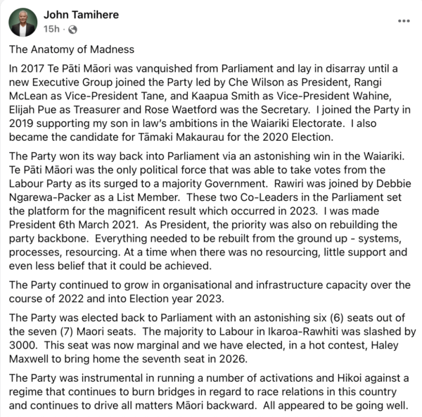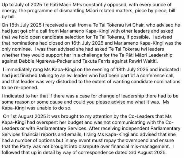 Bad bad. And what about Kaipara? She is in with Frerris and Kapa kingi too, with her endorsement of Kapa kingi. So stupid and disloyal to the people who voted for her. Agree with every single word Tamahiri wrote especially the last sentence. This is not the time of a coup. If they don’t leave they need to be expelled. Why did they bother even being part of TPM, they should have gone independent instead they are like snakes in the grass. Greedy egoistic and fucking stupid. Do their electorates support them? If they do they shouldn’t because they really do not care about their electorates, only themselves.