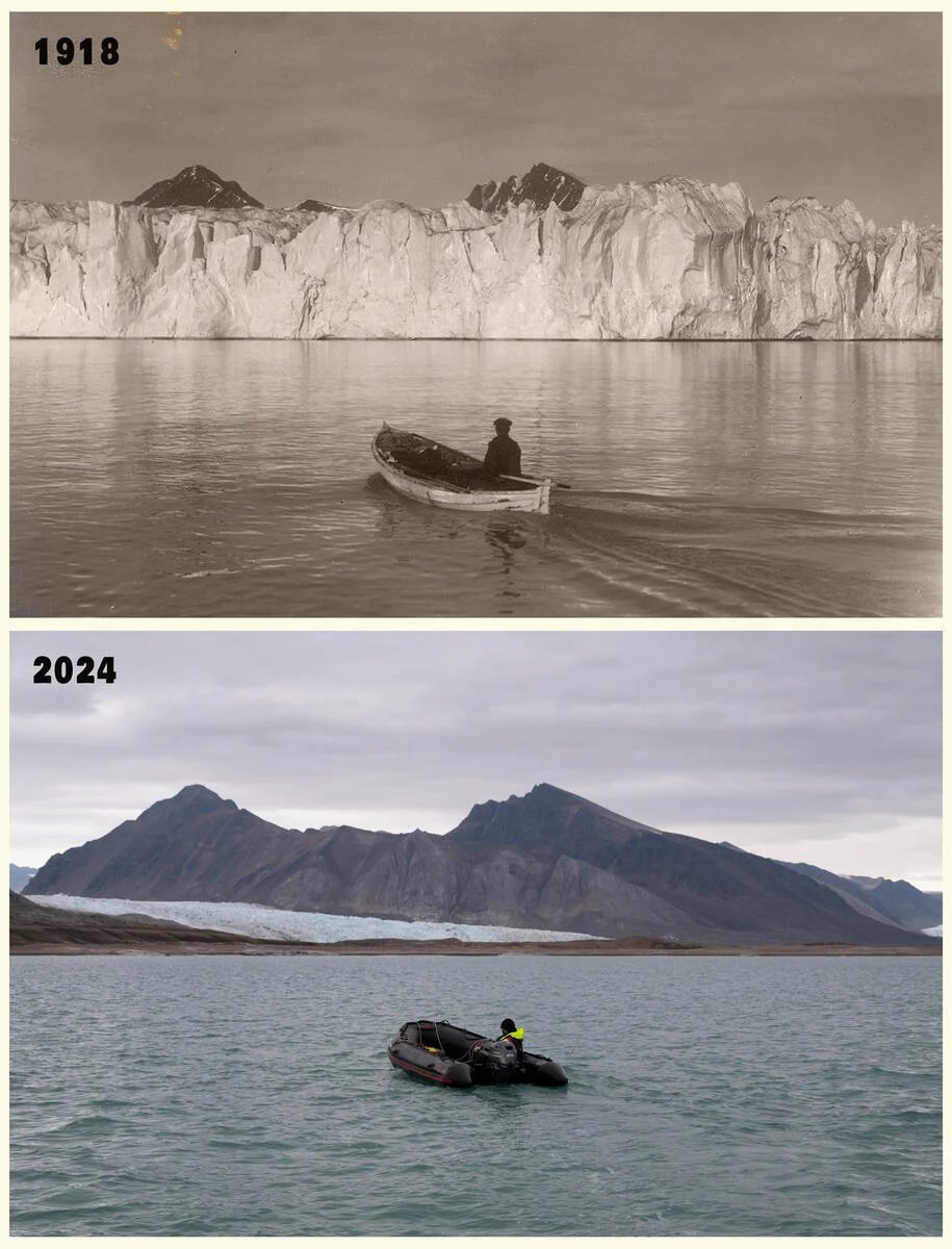 The project involved recreating 20th century photos from the Norwegian Polar Institutes archive, revealing the extent to which the ice has retreated: where there once were vast glacier walls, there is now just soil and water without any ice..