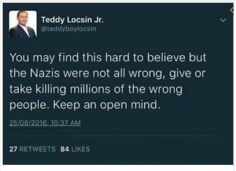 Instead they were more than happy to meet with a high ranking official of the Philippines who is a Nazi sympathizer. Which then strikes one as odd that the memorial service they are bleating about concerns how under a far right regime ( Nazi’s ) 6 million men women and children ( 1939 – 1945 ) were murdered…