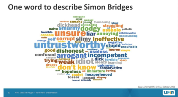 I think you seriously underestimate how many people actually prefer “untrustworthy” over “honest” or “slimy” over “empathetic”, if everything I’ve witnessed regarding democratic world leaders is anything to go by (not counting the last US election, which I’m sure had both candidates firmly in the Simon Bridges cloud). But John Key? John Howard? Kevin Rudd? Bill Clinton? Margaret Thatcher? Ronald Reagan? Netanyahu? Sarkozy? Silvio Berlusconi? Tony Blair? Macron? Mugabe? Zuma? Theresa May? I don’t need to go on.