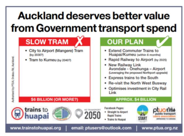 A public campaign gets underway this Wednesday 1st May, with ads running in the New Zealand Herald entitled “Auckland deserves better value from Government transport spend”. The campaign highlights sensible transport solutions, a ‘Smart Plan’, which the Government refuses to consider, compared with how much it wants to spend on a slow airport to city tram line, and the illusionary West Auckland tram to Kumeu. For significantly lesser amounts many alternative public transport projects could be constructed benefiting hundreds of thousands of more Aucklanders get to jobs, housing, recreation and to the country’s largest international airport.