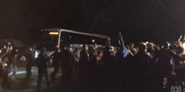 At one point, the group rushed at a bus filled with attendees, slapping it and chanting “surround the Nazi bus” while being mooned by a man inside it.
