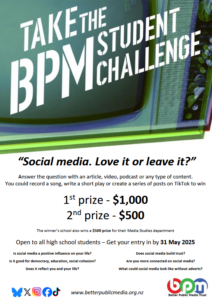 There’s been a lot of interest in BPM’s Geoff Lealand Student Challenge and we’ve had several requests to extend the deadline to allow students to think about and research this year’s question – Social media. Love it or leave it?