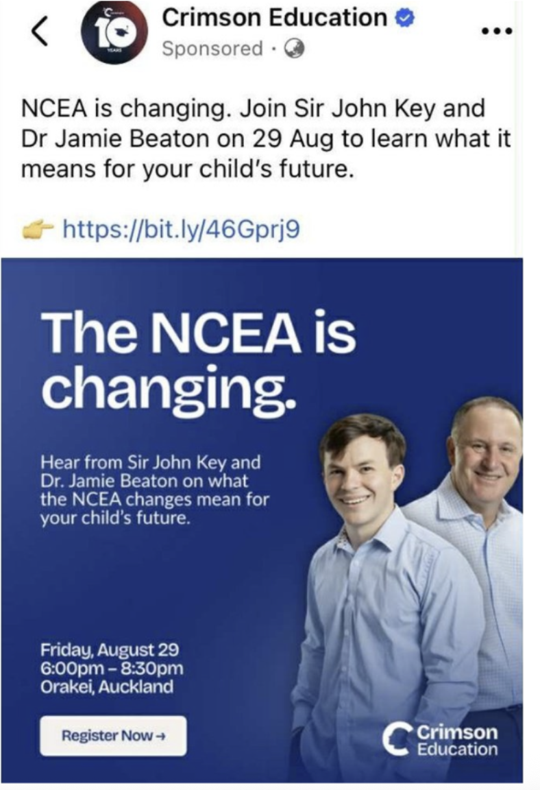 In early August there was a flurry of news items about proposed changes to NCEA. One of the people in the news at that time was Dr Jamie Beaton, of Crimson Education, and there had to be questions about his relationship with the National Party and with Erica Stanford – it was just too coincidental that Crimson Education were geared up to go with workshops about the planned changes to NCEA.