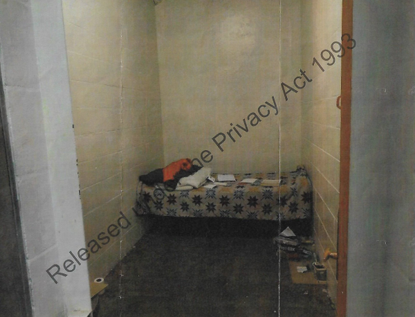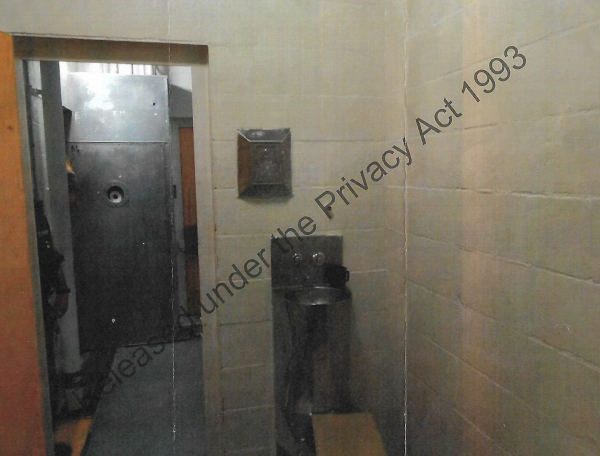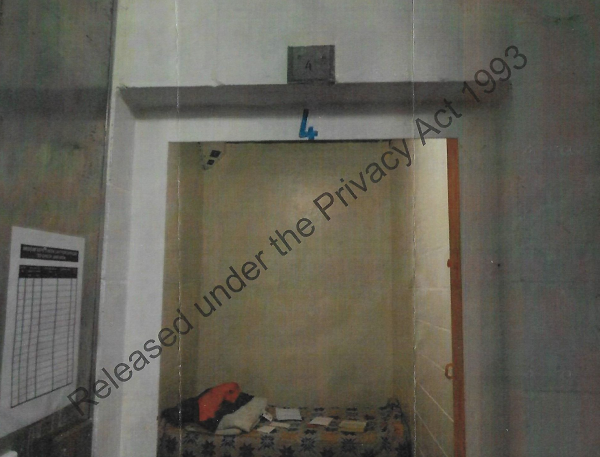 One cell in the Waikeria pound , but freshly repainted . Bed 1.65 m long between 2 walls