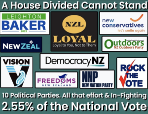ACT – Started out with so much promise by using the culture war ammunition the woke middle class activists generated and leveraged the resentment against Labour, but the naked extremism of ACT and what they intended to do scared voters once they got over their blind anger towards Labour. ACTs extremist policy agenda spooked voters and left ACT with gun lobby fetishists and Treaty race baiting. We all wait to see if ACTs race war generating racist referendum will be allowed past Winston after the Specials.