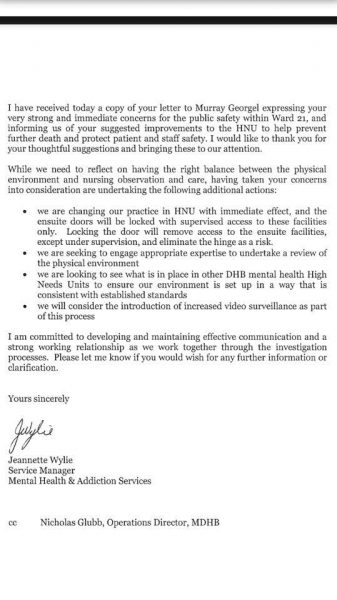 Palmerston North Hospital management was asked to keep them open, after a short-sighted DHB policy decision to close them. Mental Health Services Manager Janette Wylie replied in a letter to Mr Ricky Gee, a family member of another patient who had earlier died in the same facility, that she would be looking into the issue.